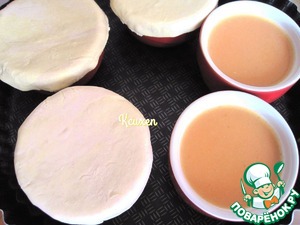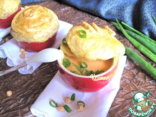 Духовку разогреваем до t 200-205 градусов. Суп-пюре разливаем по порционным горшочкам или формочкам. Размороженное слоёное тесто немного раскатаем и вырежем из него кружки, по размеру чуть больше диаметра горшочков. Каждый горшочек накроем кружком из теста. Поверхность теста немного смажем водой.