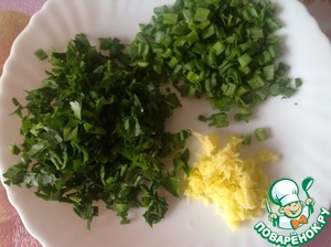 Мелко нарезать зеленый лук, кинзу или петрушку, на мелкой терке натереть имбирь.