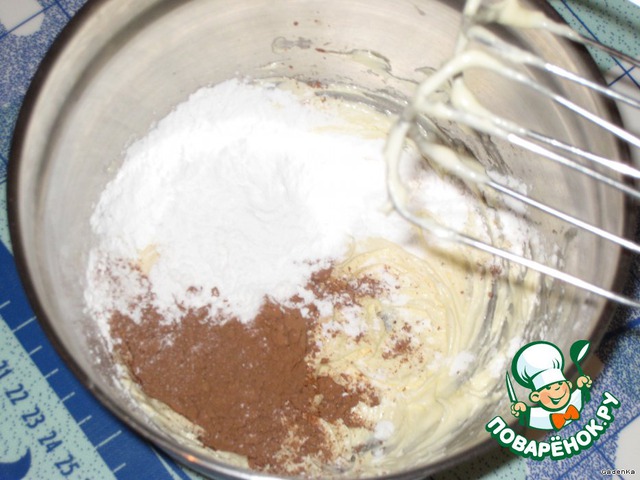 Масло растереть с 2 ст. л. сахара, добавить ванилин, мускатных орех, крахмал и какао, хорошо вымесить.