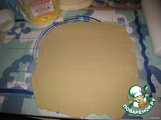 Стол хорошо подпылить мукой, т. к. тесто не очень крутое, но раскатывается хорошо, не прилипает.