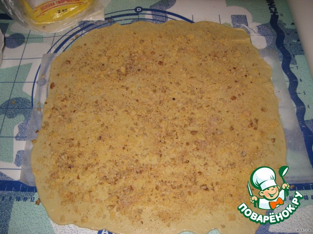 Тесто раскатать в очень тонкий прямоугольный пласт.