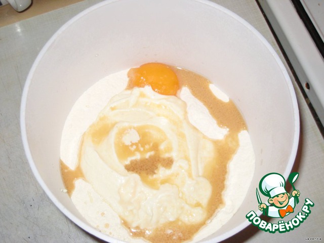 Муку с разрыхлителем просеять, добавить желток, соль, сметану с манкой, заварку, растопленный (не горячий) маргарин и замесить тесто.