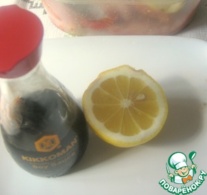 Складываем в судок, заливаем соевым соусом ТМ "Kikkoman", хорошо перемешиваем