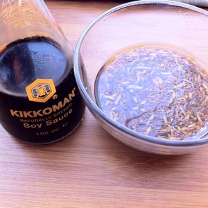 • Для маринада смешать соевый соус, рисовый уксус, оливковое масло, сок и цедру лайма, тертый чеснок и тертый имбирь.