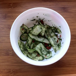 • Огурцы нарезать ленточками при помощи овощечистки. Добавить мелко нарезанный перец чили и укроп. Для заправки смешать сок лайма, оливковое масло, рисовый уксус, соль и тертый имбирь.