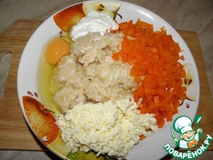 Добавить к фаршу натертый сырок, яйцо, мелко нарезанный сладкий перец и сметану. Посолить, поперчить и хорошо перемешать.