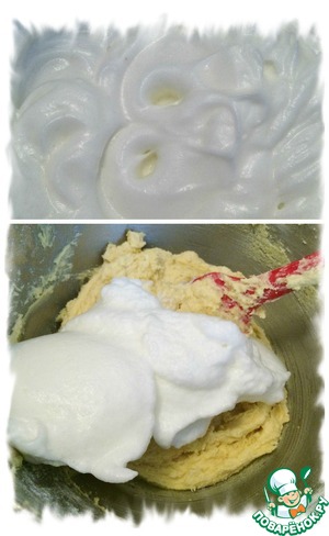 Белки взбить до устойчивых пиков. В два приёма аккуратно вмешать лопаточкой белки в миндальное тесто.