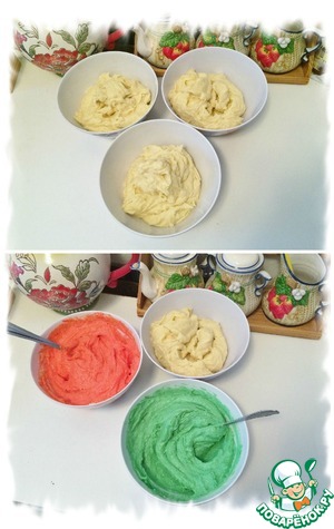 Разделить тесто на 3 равные части. Одну часть оставить белой, две других покрасить пищевым красителем в красный и зелёный цвета.