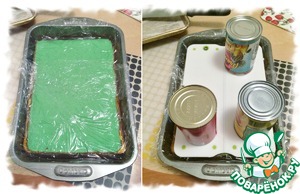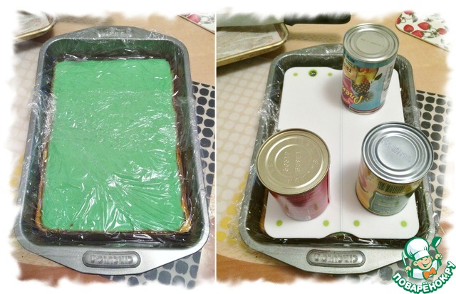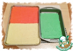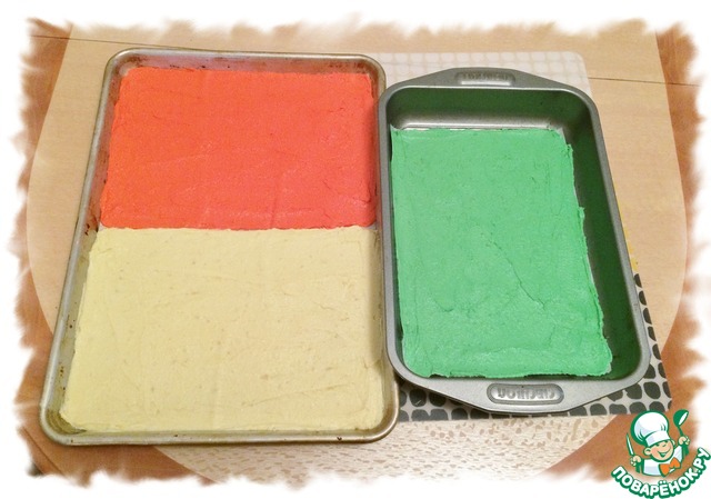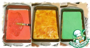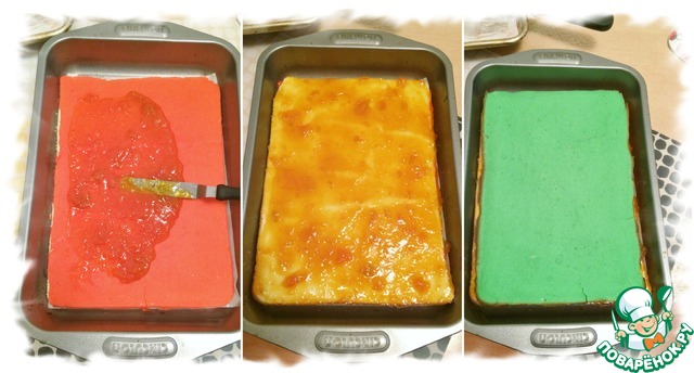 Красный корж положить на дно форы и смазать тонким слоем джема, сверху уложить белый и тоже смазать джемом, на белый положить зелёный и ничем не смазывать. Если джем сильно густой, то его можно немного подогреть.