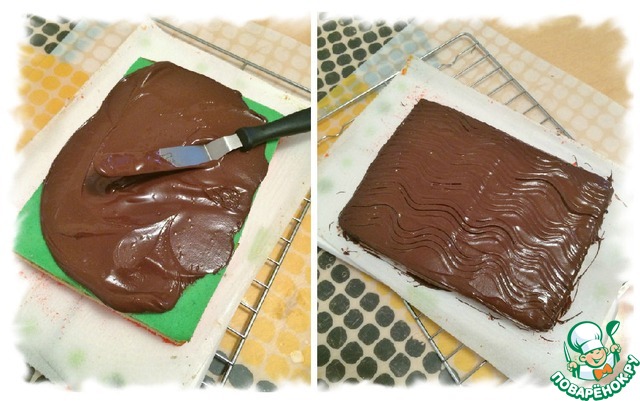 Покрыть коржи шоколадом и распределить глазурь равномерно по всей поверхности, можно вилкой нарисовать волнистые узоры. поставить в холодильник на 30-40 минут.
