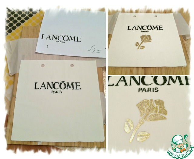 Через пару дней, когда мастика подсохнет, сделать надпись чёрной пищевой краской при помощи тонкой кисточки или можно использовать пищевой карандаш. Ещё через день срисовать розу жёлтым пищевым карандашом и покрыть её золотой пищевой краской. Краски надо развести буквально 1-2 каплями спирта или водки.