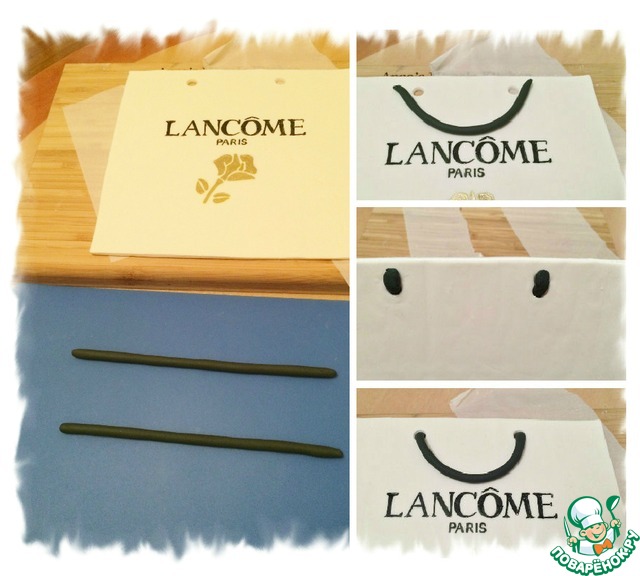 Из чёрной мастики раскатать 2 тонких жгутика, примерить к дырочкам, продеть сквозь них и закрепить при помощи воды или сиропа с обраной сторны. оставить сохнуть на пару дней.