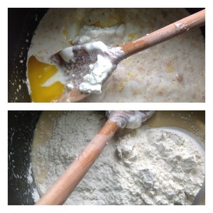 Одно яйцо взбить со сметаной и добавить к опаре, масло растопить немного остудить и тоже добавить. Перемешать и добавить 2 стакана муки и вымешивать тесто.