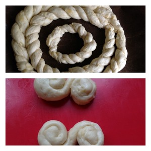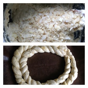 Добавить миндальные лепестки, перемешать. Добавить 1 стакан муки и вымешивать тесто. В конце добавить растительное масло и еще немного вымесить тесто. Оно нежное получается и не липнет к рукам, но и не забитое мукой. Оставляем на 1,5 часа в теплом месте, пока тесто не увеличится в двое. Тесто раскатать в пласт, нарезать узкими полосками, свить в косички.