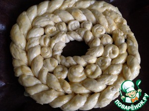 Оформить пирог как показано на фото. Смазать взбитым яйцом и отправить пирог в духовку при 190 гр до золотистого цвета.