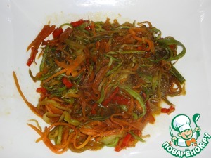 Мясо готово и мы начинаем собирать наш салатик. Итак, овощи тушеные в соевом соусе уже в салатнике, добавляем к ним фунчозу и мясо ( если осталось немного мясного сока оно и к лучшему все в салатик). Сверху кладем кукурузу, лук ( предварительно слив уксус), огурец ( его нарезаем тоненькими полосочками как морковь и кабачок и самое главное в последнюю очередь)