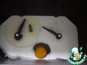 Я замешивала тесто в ХП, в ведро которой влить чуть тёплое молоко, растительное масло, добавить соль, сахар, яйцо