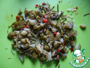 Пока замешивается тесто нарезать небольшими кусочками маринованные огурцы-я ещё добавила лук, укроп и перец из маринада. Сыр натереть на крупной тёрке