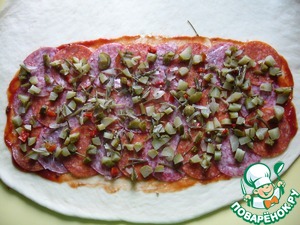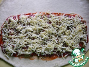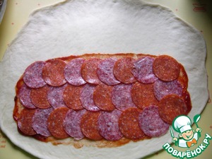 Готовое тесто хорошо обмять и выпустить лишний воздух. Раскатать в поперечный овал, толщиной 3-5 мм. Смазать чуть больше половины кетчупом, уложить колбасу (у меня готовая нарезка-кусочки очень тоненькие)