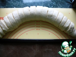 Полученный рулет выложить на противень, застеленный бумагой для выпечки и смазанный маслом. Придать рулету форму подковы, поправить полосы. Накрыть полотенцем и поставить в тёплое место для подъёма (примерно 15-20 минут)