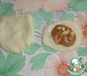После чего тесто выкладываем на рабочую поверхность посыпанную мукой. Раскатываем в пласт и вырезаем кружочки. Кладем на кружочек по 1 ч. л. вареной сгущенки.