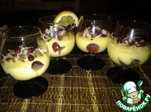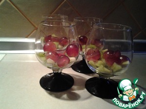 В бокалы поместить кусочки фруктов. Выложить сверху приготовленный крем.