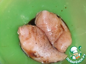 Филе перекладываем в миску, наливаем соевый соус, перчим. Оставляем на 40 минут для маринования. Через 20 минут филе нужно перевернуть, для равномерного маринования.