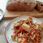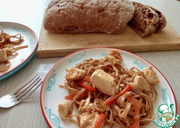 Лапшу отвариваем до готовности, промываем. Овощи очищаем, морковь трём на тёрку, лук режем полукольцами, перец соломкой. Жарим лук с морковкой на оставшемся после курицы масле до золотистого цвета.