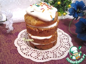 Выпекаем куличи в разогретой духовке 20-30 минут или до готовности. Дадим изделиям остыть на решётке под тканевой салфеткой. Затем разрежем поперёк на 2-4 части ( в зависимости от размера куличиков)