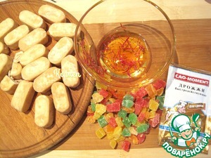 Конфеты и цукаты крупно порубим. Шафран зальём двумя столовыми ложками горячей воды и дадим настояться.