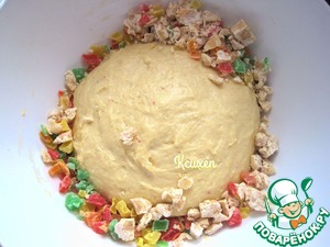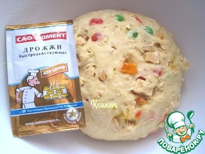 Тесто ещё раз вымешиваем, добиваясь равномерного распределения кусочков конфет и цукатов. На этом этапе возможно понадобится ещё мука. Тесто получится мягкое, почти не липкое, хорошо держащее форму. Посуду с тестом накрываем и отправляем в тёплое место для повторного подъёма (на 30-40 минут)