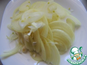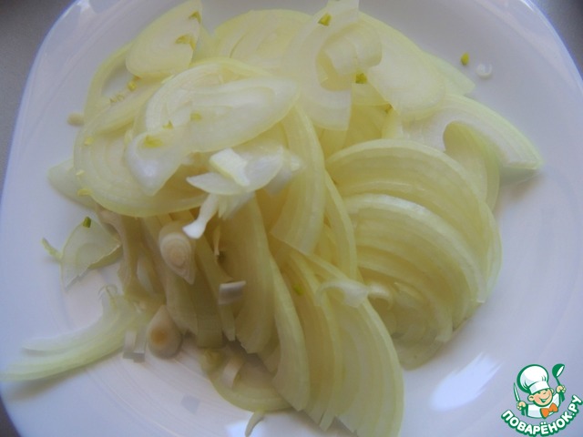 На лук выкладываем рыбу. Остатки маринада выливаем в форму.