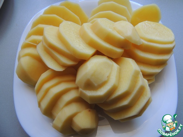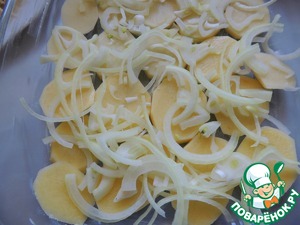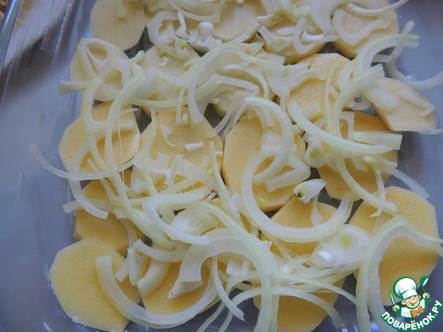 Выкладываем на дно формы, смазанной маслом, слой картофеля, затем часть лука. Солим и перчим по вкусу