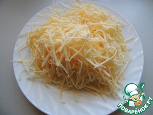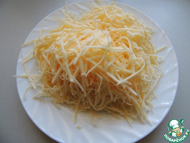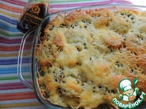 Выкладываем остатки лука и закрываем всё слоем картофеля, солим, посыпаем рубленной зеленью. Сделаем сеточку из майонеза и засыпаем всё сыром.