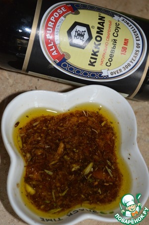 Для маринада смешать оливковое масло, соевый соус, перец, измельченный чеснок, тимьян, добавить по вкусу тобаско.