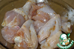 Куриные голени и крылья сложить в миску, филе нарезать небольшими кусочками. Залить маринадом и перемешать.