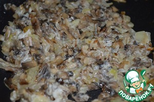 Грибы и лук мелко нарезать и обжарить на растительном масле, посолить, поперчить по вкусу и в конце добавить сметану, прогреть.