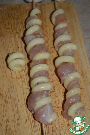 Филе нанизать на шпажки, а сверху надеть спиральки из картофеля.