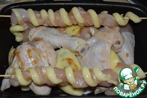 Шпажки положить на форму и запекать в духовке при температуре 200 С до готовности.