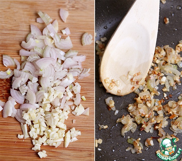 • Лук с чесноком очищаем, мелко рубим и обжариваем на оливковом масле, сдобрив перцем (ароматы при обжарке с перцем - не передать словами!!!).