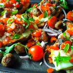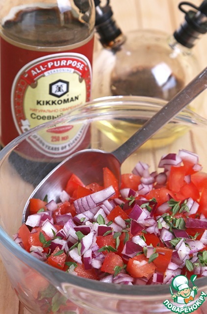 • Тем временем сделаем томатную сальсу. Для этого извлекаем из помидоров семечки, режем мелкими кубиками, добавляем измельченный лук, листься тимьяна (это у меня) или кинзы (это в оигинале), уксус, масло и соевый соус, переиешиваем и отставляем в сторону до подачи.