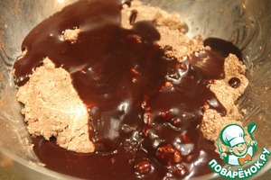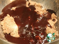 Влить шоколад, добавить цедру и шоколадные капли, сметану, перемешать. |