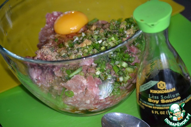 Подготовим фарш. У меня самодельный из говядины домашней и свинины. Добавляем соевый соус Kikkoman, имбирь трем на мелкой терке, мелко порезанный лук, зелень, яйцо, чесночный перец, соль. Вымешиваем хорошо фарш и оставляем настояться со специями.