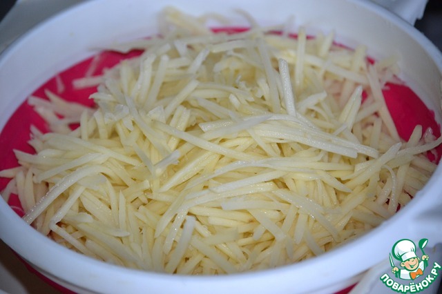 Чистим картофель и натираем на терке. Промываем холодной водой от лишнего крахмала.