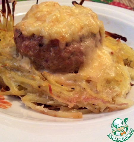 Картофель тер на терке для морковки по-корейски, промывал раз 5. В одни котлетки положил кусочки сыра в другие - тертый сыр + кусочек сливочного масла. Сами "гнезда"для запекания выкладывал на капустные листы. Получилось красиво и вкусно.