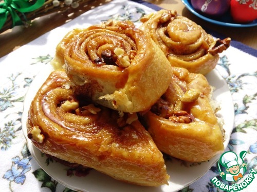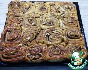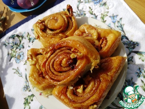 Булочки замечательные! Очень нежные с хрустящей карамелью. Орехов к сожалению не было. Стояли в холодильнике 11 часов - подошли прекрасно. В следующий раз возьму противень побольше)) Фото в альбоме https://www.povarenok.ru/album/7043/