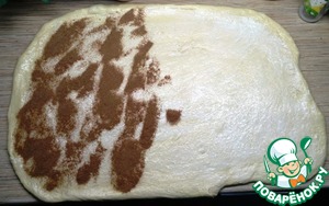 Когда тесто подошло, выкладываем его из миски на стол, смазанный растительным маслом. Раскатываем в большой пласт размером примерно 70х43 см. Смазываем размягченным сливочным маслом и посыпаем сахаром с какао. Сворачиваем в рулет с длинного края, защипываем хорошенько шов и нарезаем на булочки примерно по 3 см.