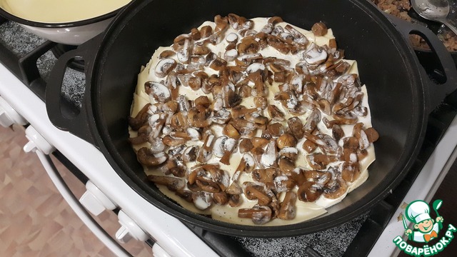 Мы с мужем очень любим лазанью. Пробовала делать с соусом бешамель- вкусно, но более хлопотно, да и со сливками нам кажется ничуть не хуже, на наш вкус даже лучше, сочнее))) Итак начнем. Шампиньоны помыть, порезать и обжарить до золотистости. Посолить, поперчить по вкусу.