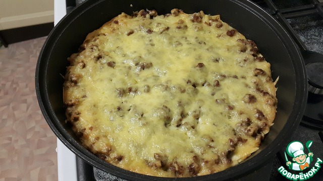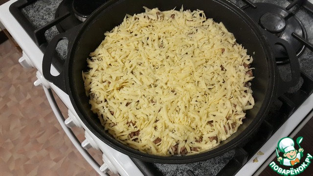 Распределяем сверху оставшийся фарш и густо посыпаем его тертым сыром. Иногда часть сыра я кладу в слой с грибами. Импровизируйте))).