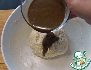 Когда опара готова, просеиваем оставшуюся муку, смешиваем ее с солью, выливаем опару и добавляем сахар. Замешиваем тесто оно будет очень крутым, но это не страшно так как еще нужно добавить масло. Тесто вымешиваем около 10 минут.
